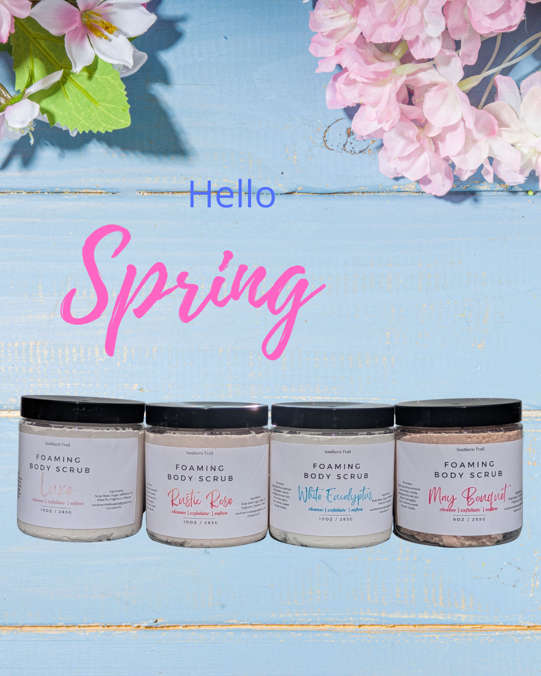 Airy, bright, and skin‑polishing. Our spring scrubs foam into a soft lather that leaves skin smooth, fresh, and lightly scented